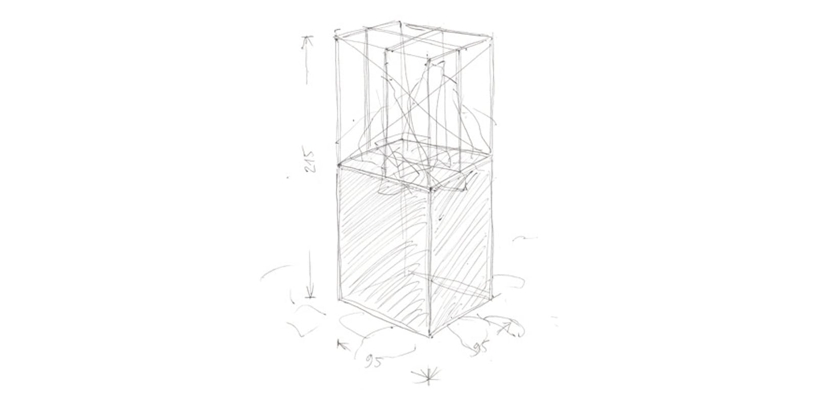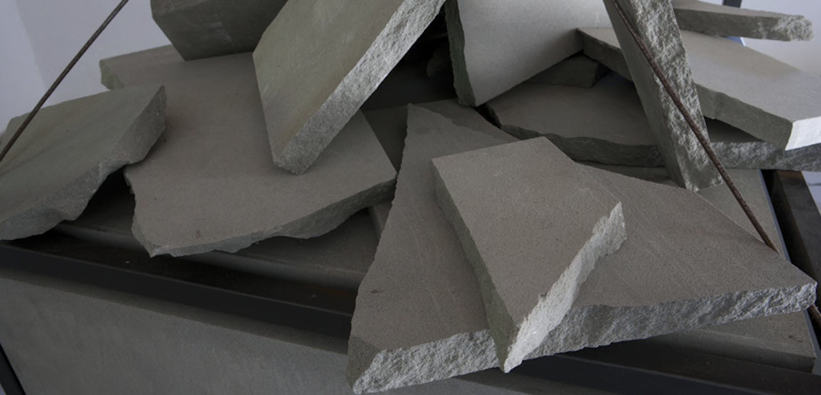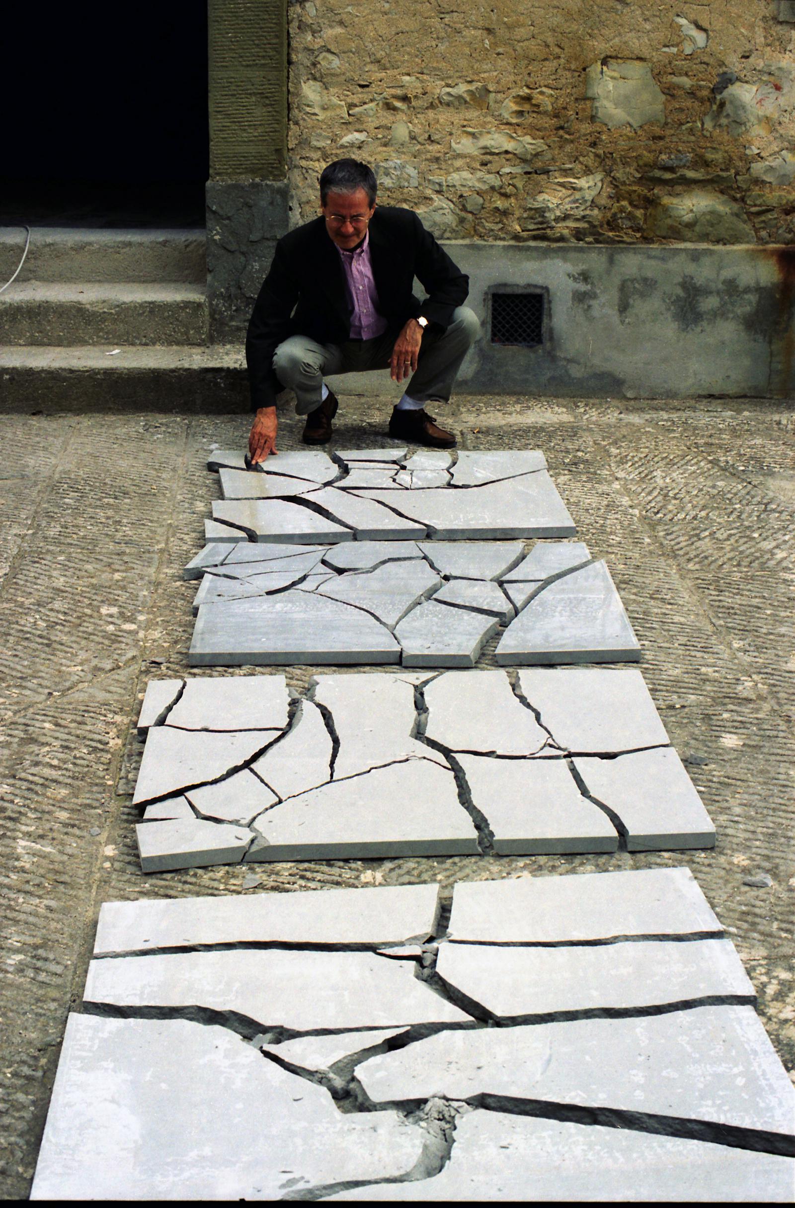 […] This is "Paradigma": a parallelepiped of stone slabs in a metal framework, in which two equivalent overlapping parts can be distinguished. The lower part is closed and impenetrable to the eye, opaque and solid, the upper part seems to have exploded, scattering the fragments everywhere, on the armor which remains open and transparent, and in the room in which the sculpture is positioned. The contrast is clear and clear. Indeed, precisely for this reason it will be better noticed that the slabs that make up the faces of the lower part are actually slightly separated from the armor, as if they were therefore imploding.