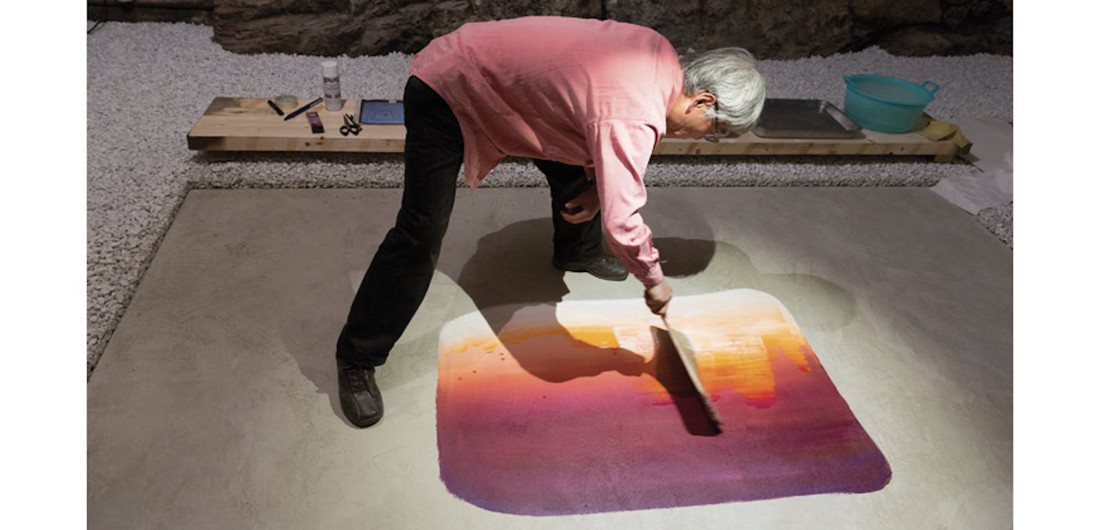 PLS As the subtitle implies, the floor painting is intended to look as if it were excavated from underground, as in an archeological dig. The hand-painted shape on the floor is thus presented not so much as created but as discovered. Is art a rediscovery of the world, of our place in the world?