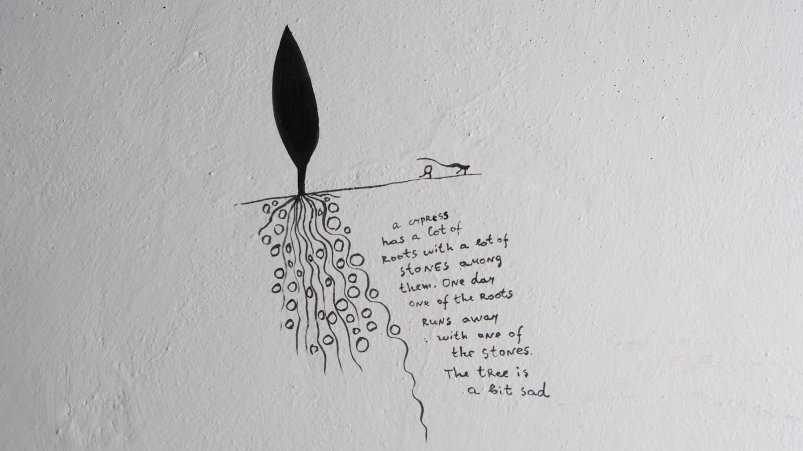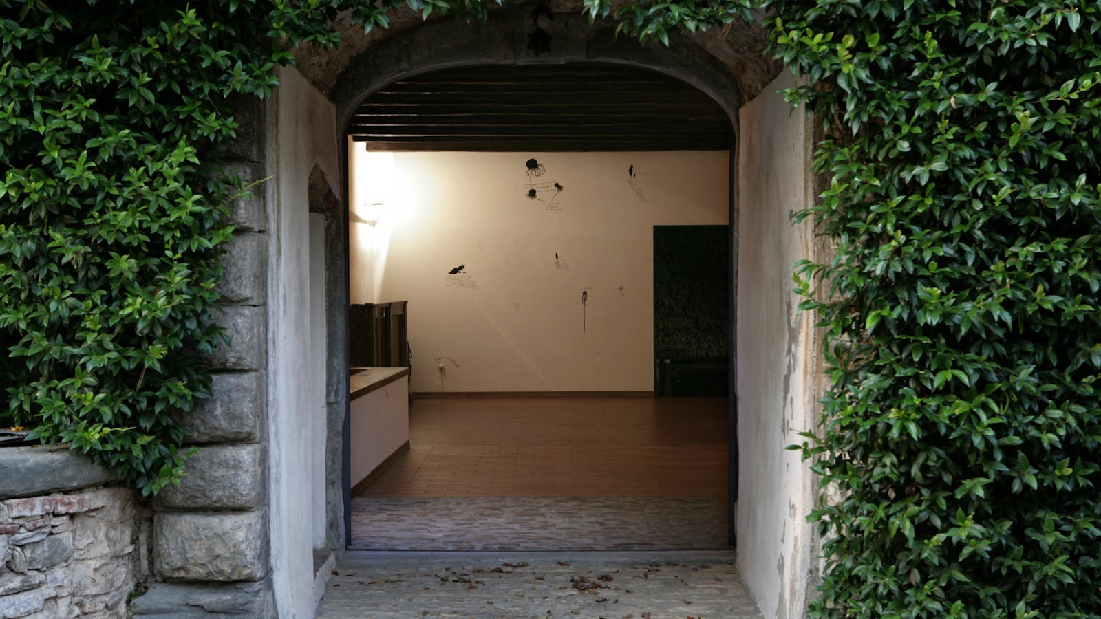 […] For the intervention at the Castello di Ama, Solakov "populates" the walls of the rooms, where his famous wine is usually tasted, with small writings and drawings, apparently childish and improvised, where with subtle irony, catchy phrases and small characters are they insinuate themselves between existing objects or between the cavities of the wall, giving rise to apparently paradoxical dialogues and situations that delve into the history, the usual intended use and the new role within the contemporary art system of the castle itself.