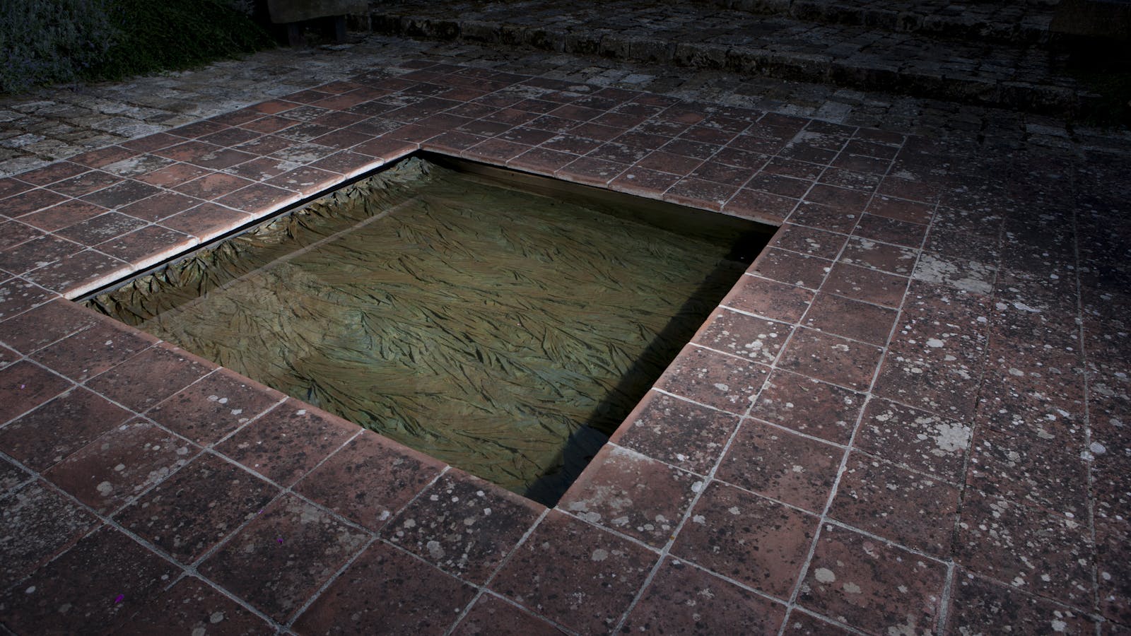 Nel mezzo del piccolo cortile, che su un lato si apre al paesaggio, uno spazio quadrato ritagliato nella pavimentazione rivela, al di sotto del livello del suolo, sul fondo, un rilievo, una scultura in bronzo – ma in realtà è resina – che mostra dei rami sistemati ordinatamente quasi a formare un tappeto.