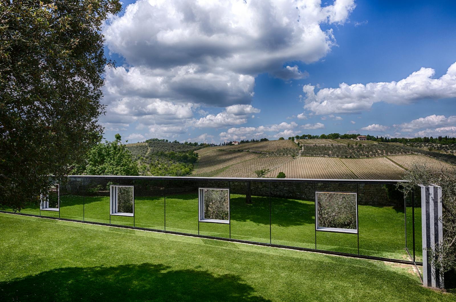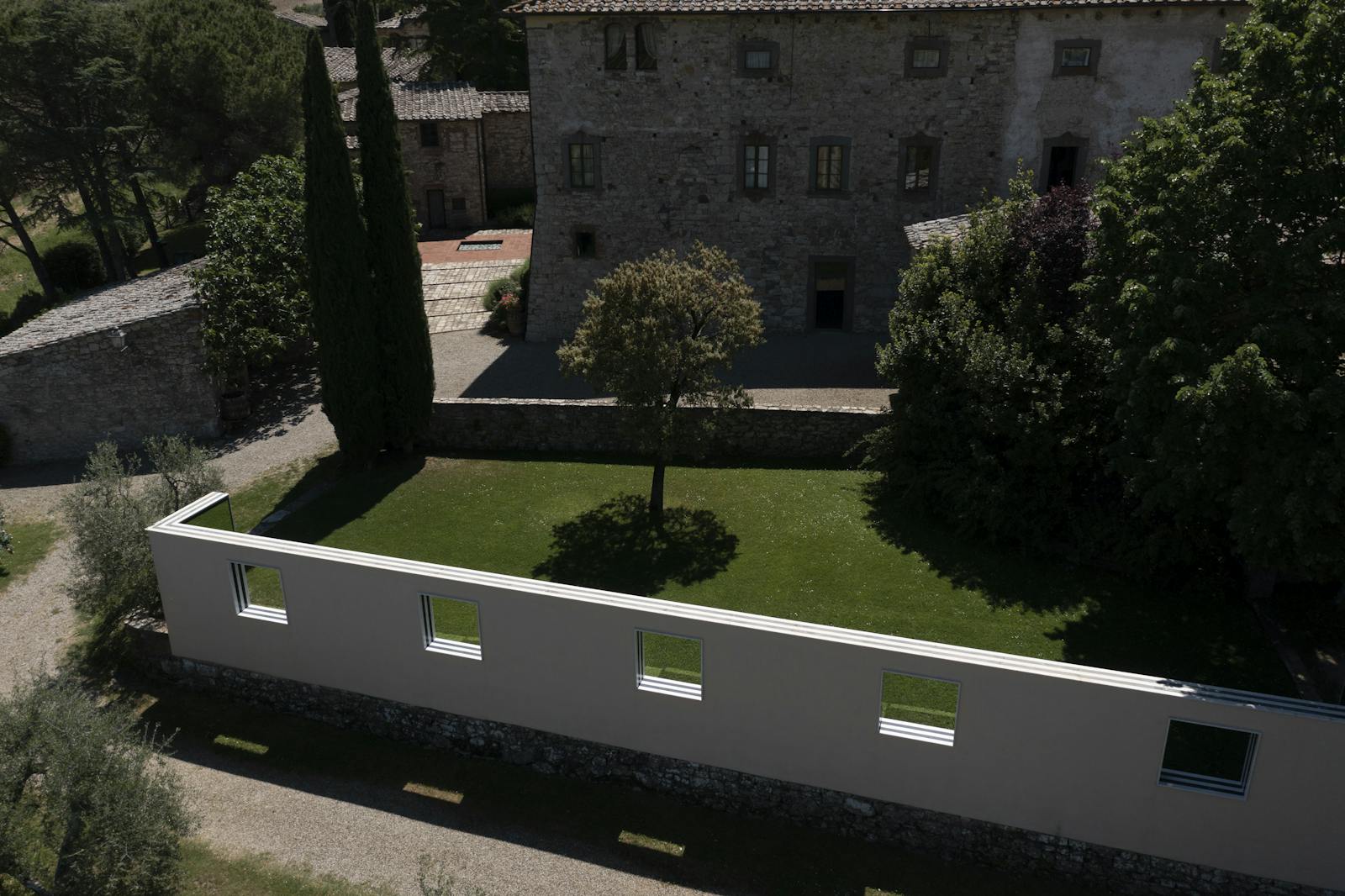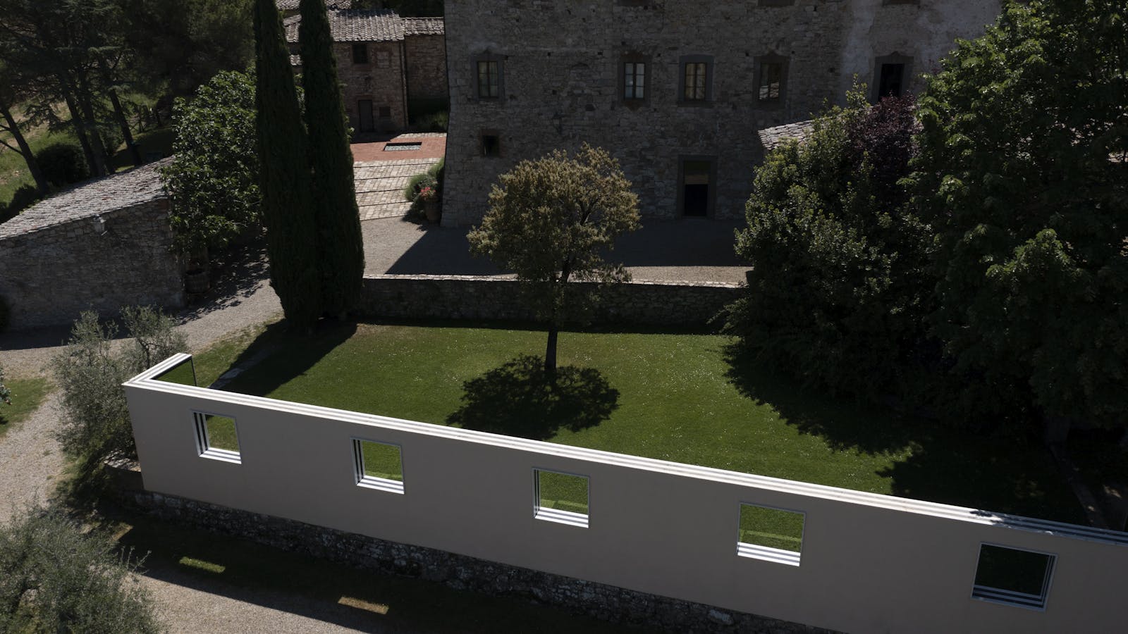 Un muro lungo venticinque metri e alto due viene costruito di fronte a uno degli edifici del complesso, allo scopo di chiudere lo sguardo sul territorio circonvicino, e nello stesso tempo di aprirlo, ma secondo particolari modalità. Il muro è costellato da finestre quadrate, che enfatizzano il già bellissimo paesaggio della vallata col fatto stesso di incorniciarlo, rielaborando così tutta una tradizione, quella della “pittura di paesaggio”, o anche il concetto, altrettanto consueto, di pittura come ”finestra” aperta sul reale. […]