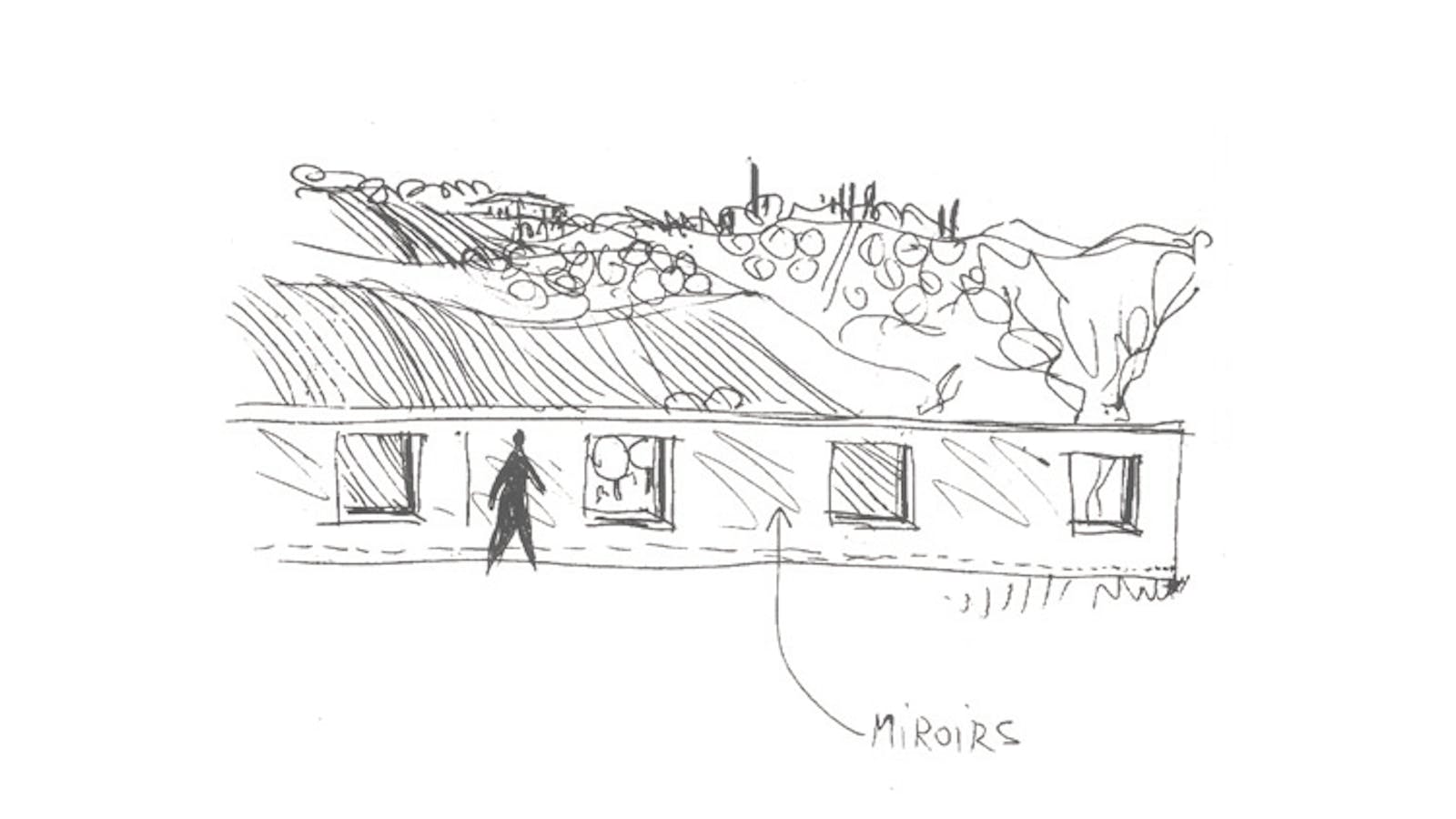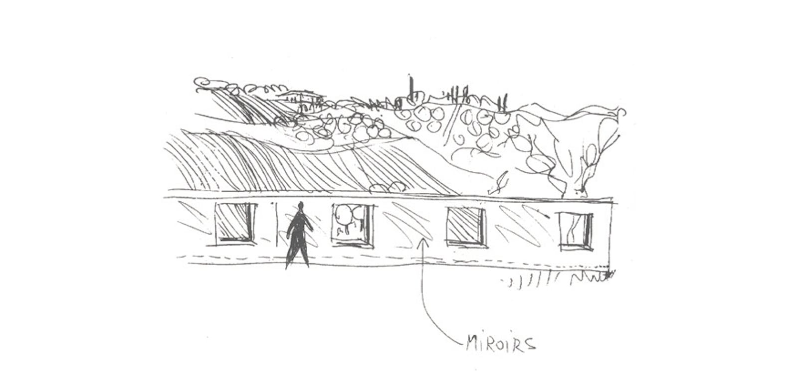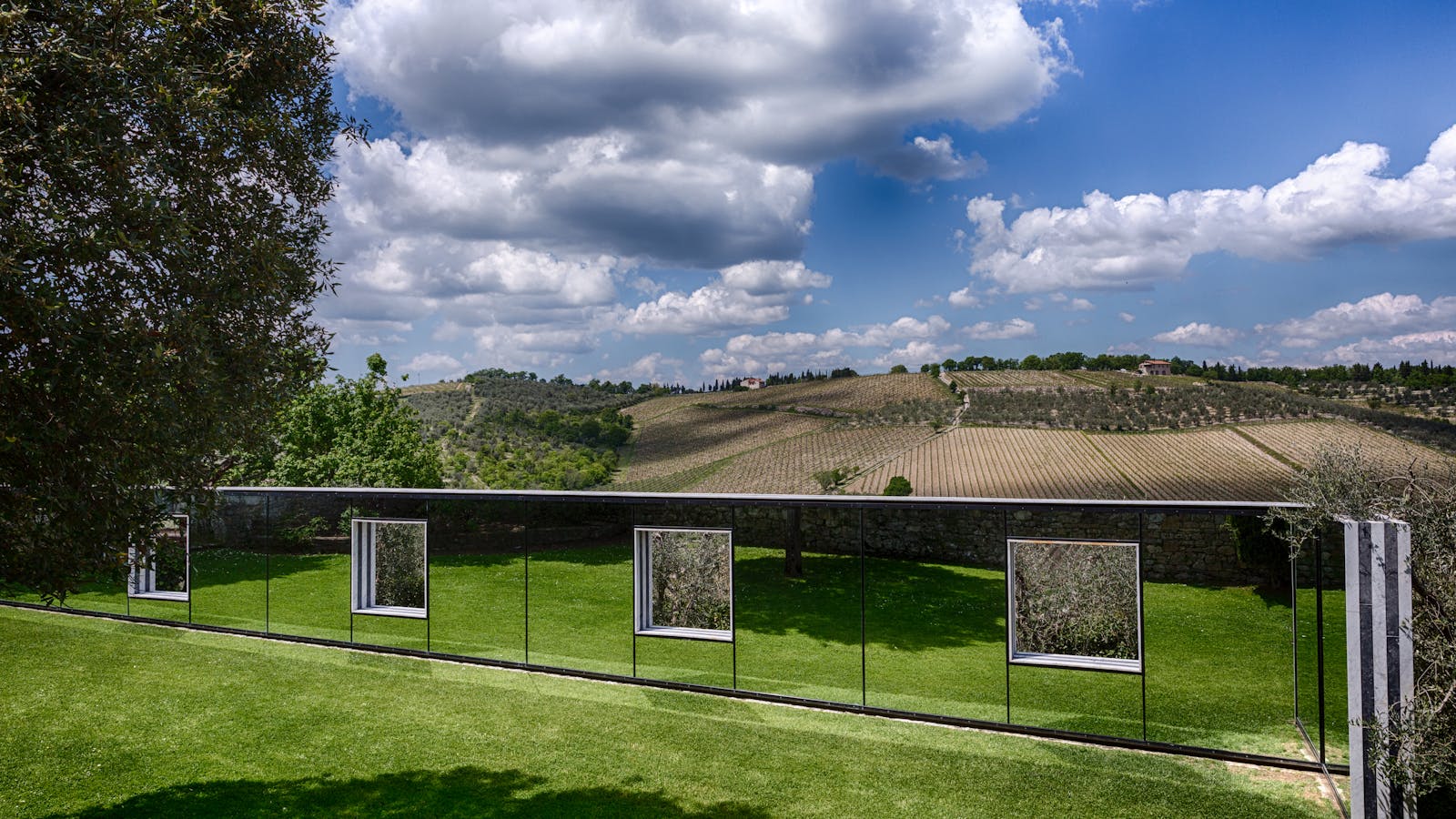 Un muro lungo venticinque metri e alto due viene costruito di fronte a uno degli edifici del complesso, allo scopo di chiudere lo sguardo sul territorio circonvicino, e nello stesso tempo di aprirlo, ma secondo particolari modalità. Il muro è costellato da finestre quadrate, che enfatizzano il già bellissimo paesaggio della vallata col fatto stesso di incorniciarlo, rielaborando così tutta una tradizione, quella della “pittura di paesaggio”, o anche il concetto, altrettanto consueto, di pittura come ”finestra” aperta sul reale. […]