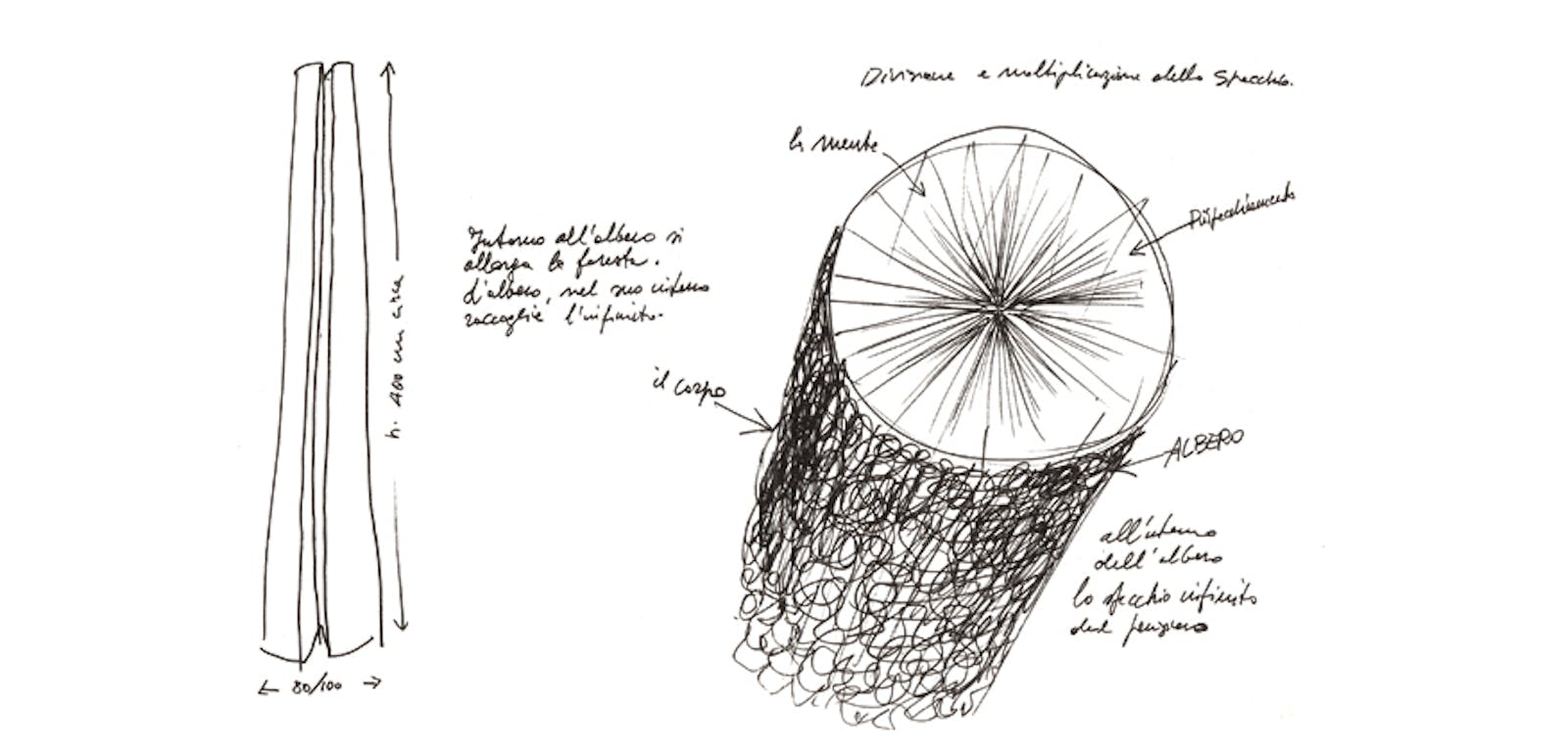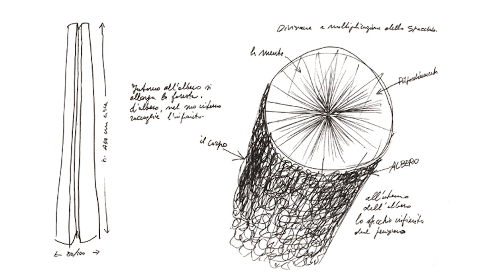 All’esterno la corteccia è opaca, mentre all’interno regna la luce della mente. Il tronco è l’unicità, la materia, l’interno la molteplicità e la labirintica riflessione del pensiero. Come all’esterno il tronco si moltiplica nella foresta, così all’interno lo specchio si moltiplica nell’iterata rifrazione, fino a ospitare l’infinito.