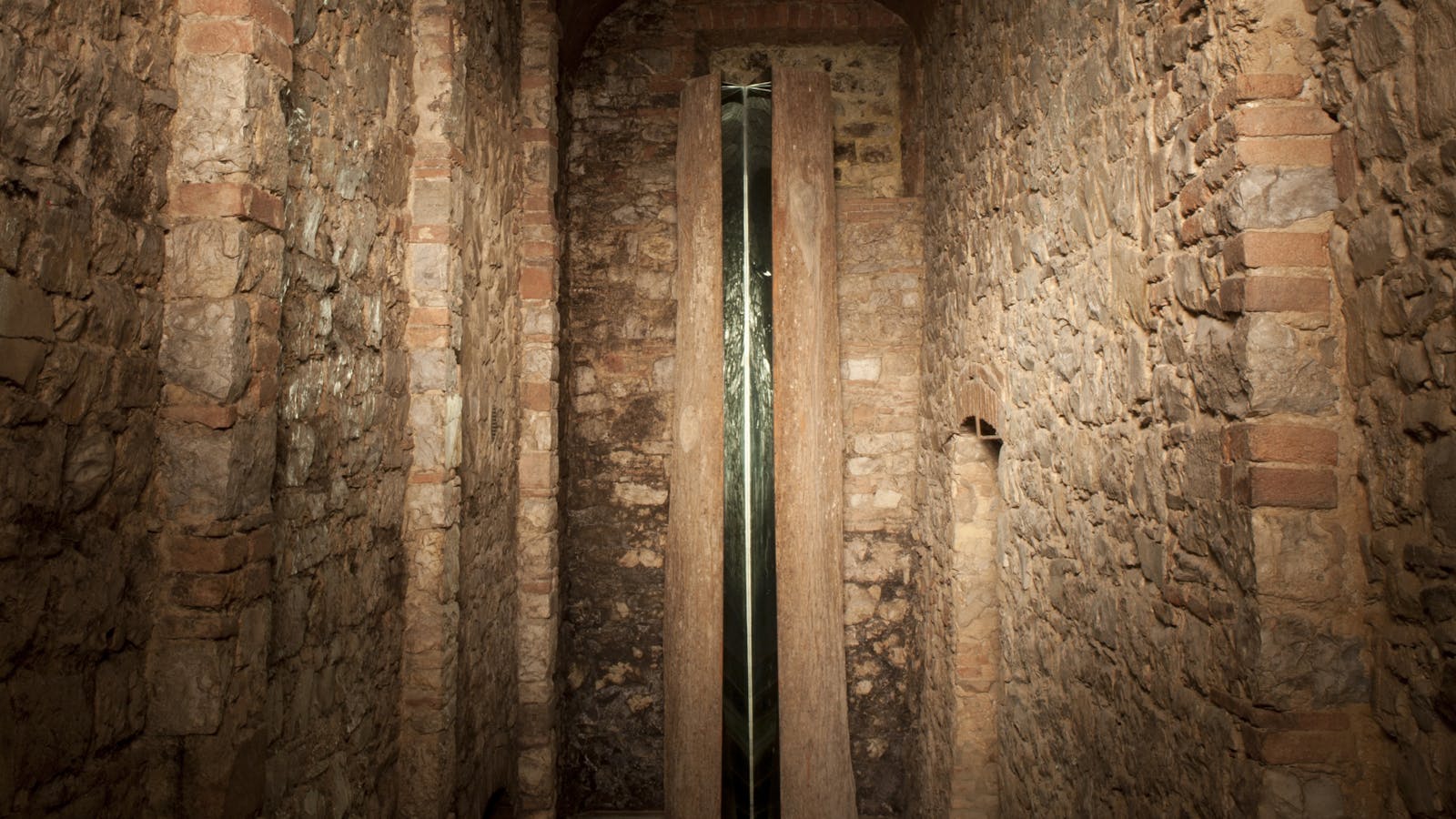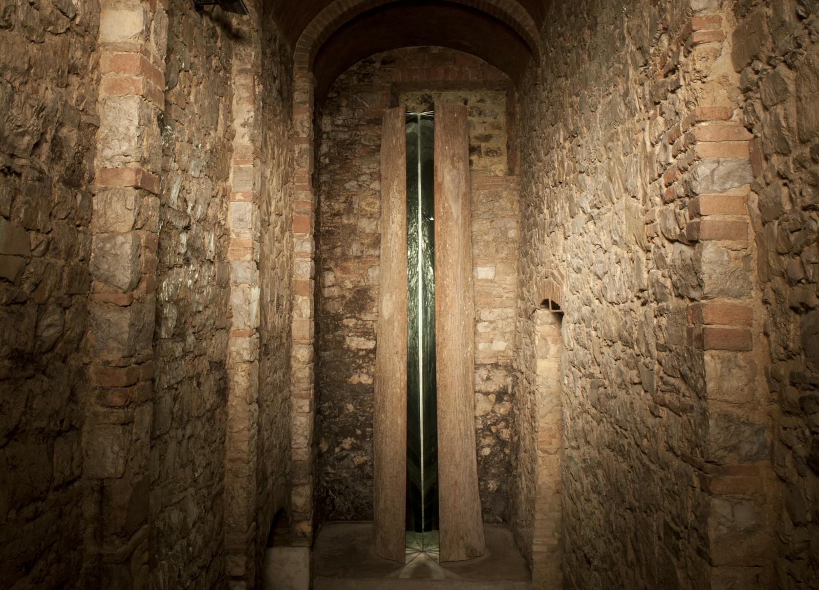 […] Dall’ingresso delle antiche cantine del Castello di Ama, vediamo, in fondo a uno scalone, ergersi un altissimo tronco, nel cui diametro è stato inserito, in una fenditura, quasi una ferita, uno specchio angolato con molteplici rifrazioni.