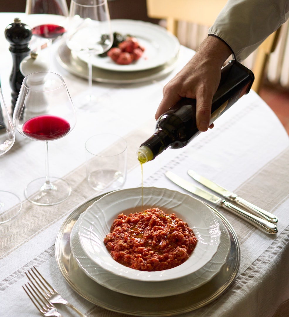 La cena a Castello di Ama è un invito riservato a chi desidera vivere la magia del borgo dopo il tramonto, quando il silenzio e la tranquillità diventano i veri protagonisti. Questa proposta è pensata per chi già conosce la nostra storia e desidera tornare per godere dell’atmosfera serale di Ama, lasciandosi cullare dai ritmi lenti della campagna chiantigiana. Senza il percorso di visita guidata, l’attenzione si sposta interamente sulla tavola e sulla purezza dei sapori.