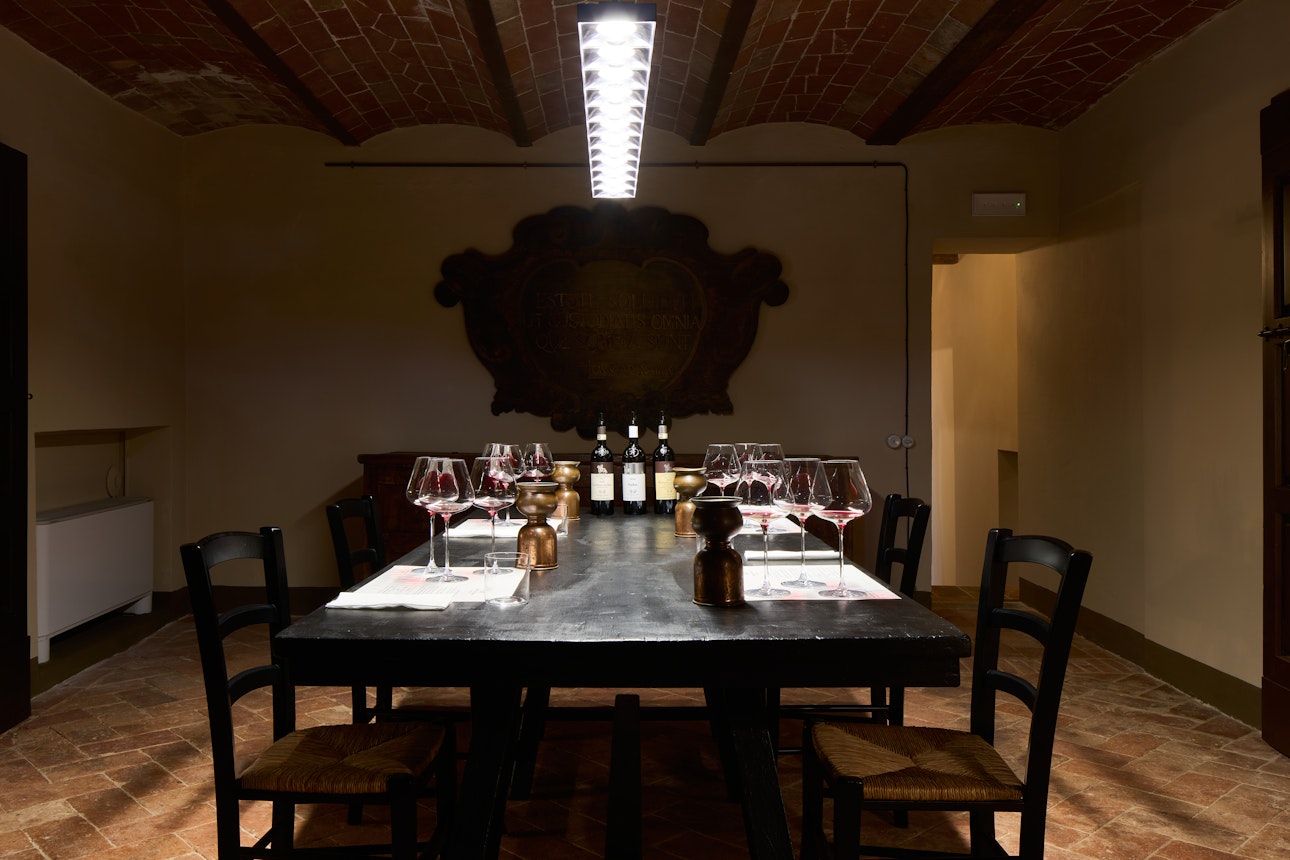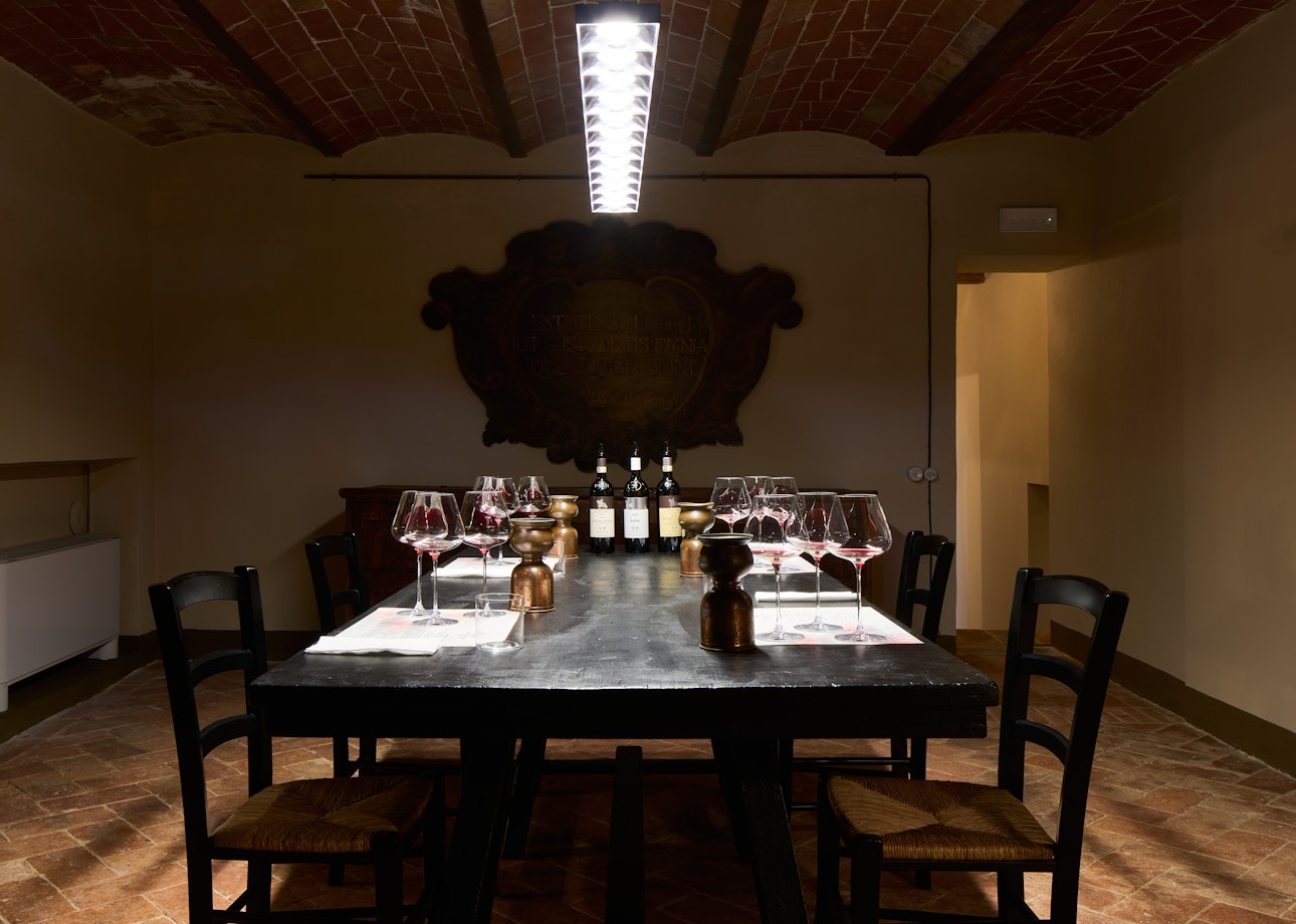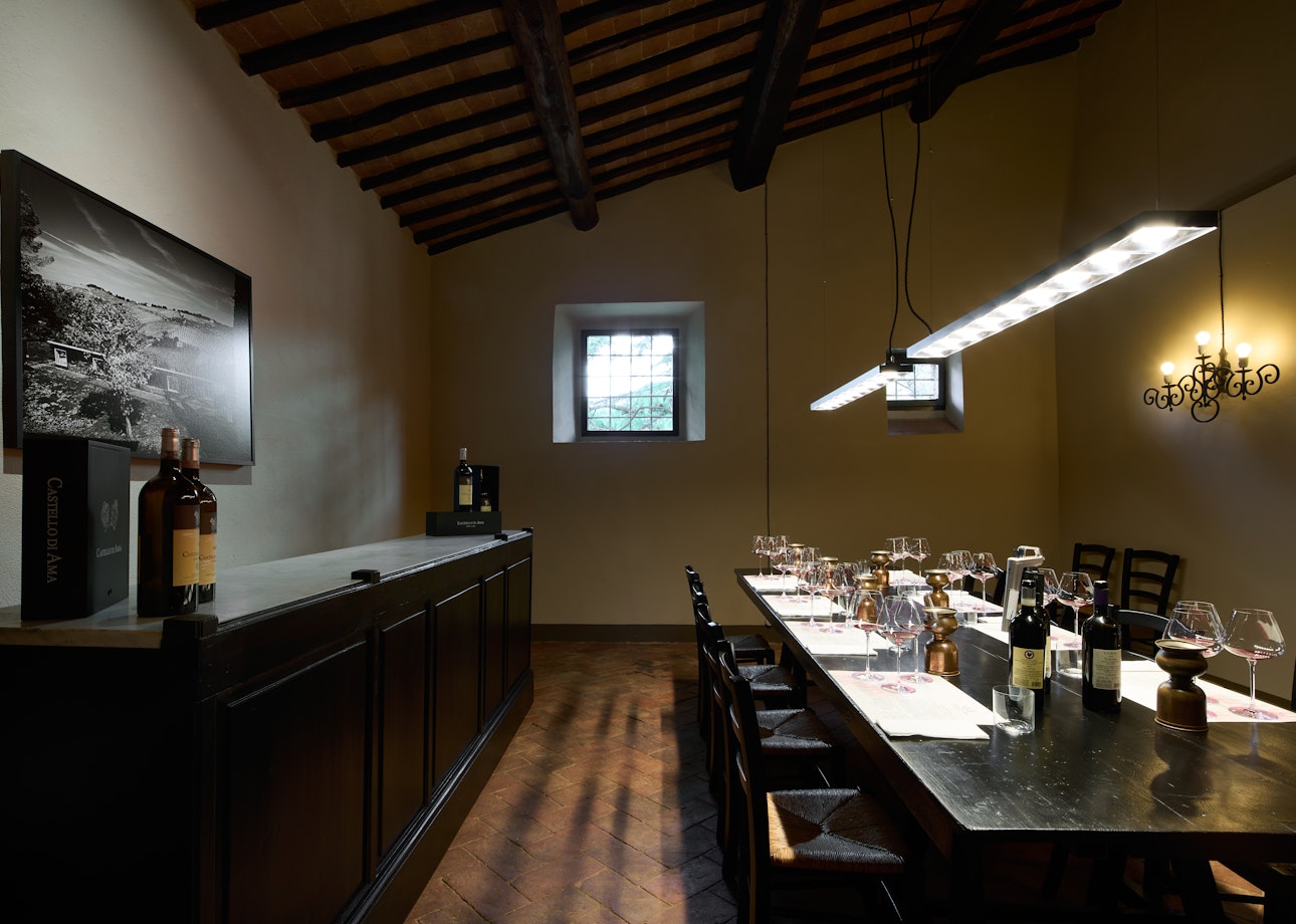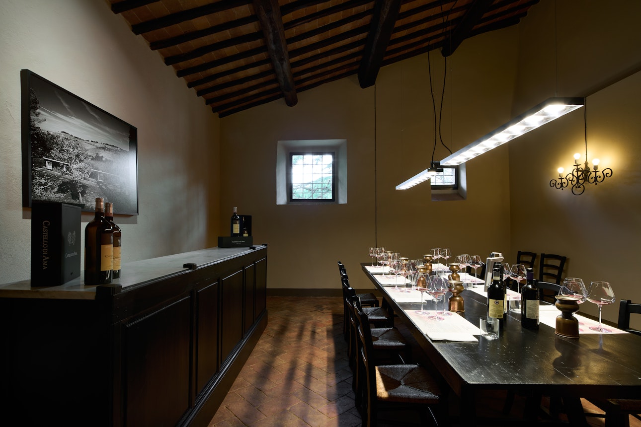 L’esperienza prosegue nelle sale della Villa con una degustazione focalizzata sui tre Chianti Classico che definiscono la tenuta. Il percorso è concepito come una successione di tre cerchi concentrici che, con crescente nitidezza, rivelano la filosofia produttiva di Castello di Ama: si inizia con l'immediatezza di Ama Chianti Classico 2023, si prosegue con l'equilibrio di Montebuoni Chianti Classico Riserva 2021, per giungere infine al cuore dell’azienda con il Castello di Ama San Lorenzo Chianti Classico Gran Selezione 2020.